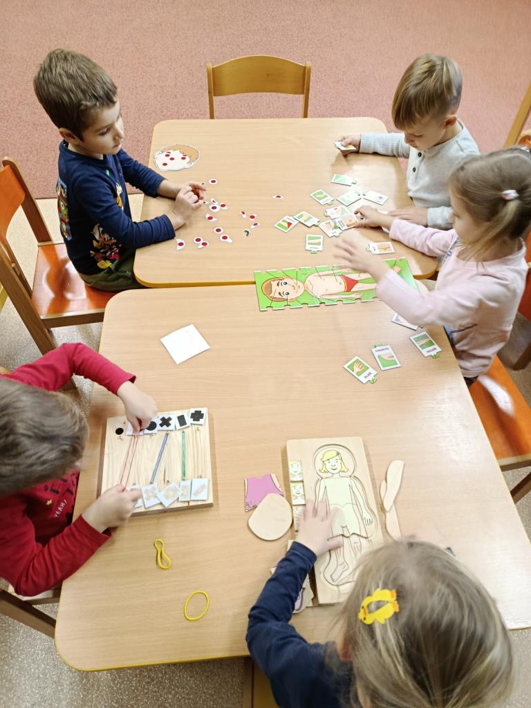 Tento týden jsme se s dětmi věnovali poznávání lidského těla. Učili jsme se pojmenovávat jeho části, třídili jsme smysly a povídali si o důležitých orgánech a jejich funkcích. Také jsme si vysvětlili, jak o své tělo pečovat a co dělat, když jsme onemocní.