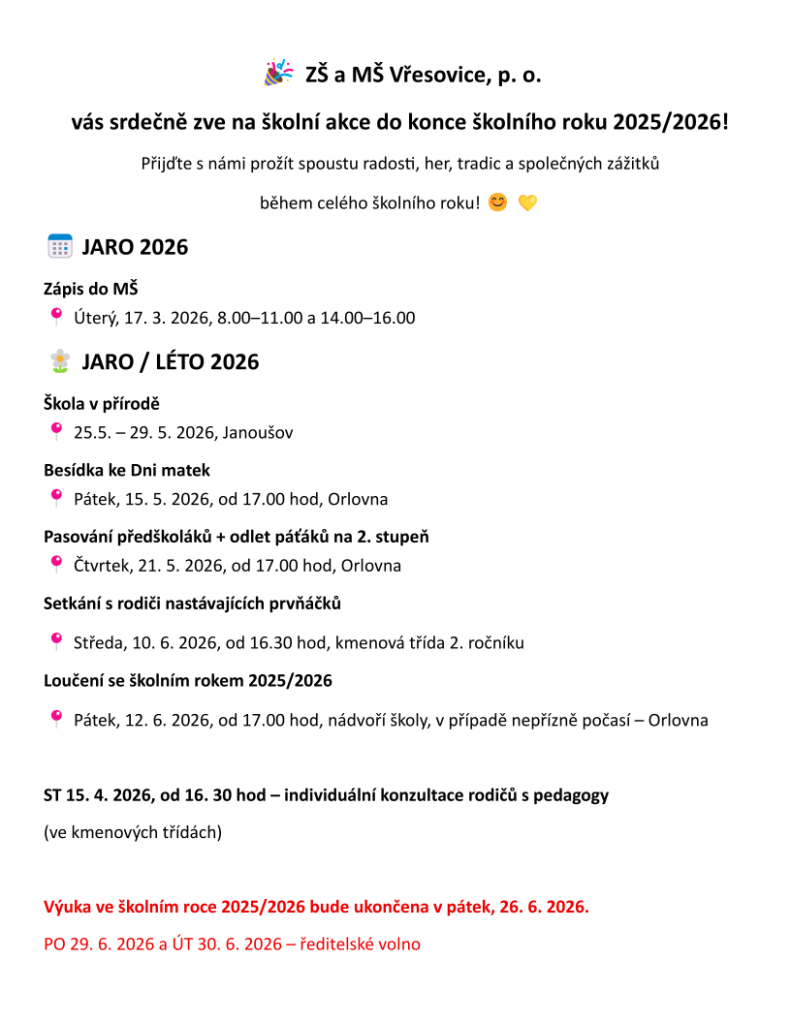 ŽŠ a MŠ Vřesovice - akce do konce školního roku 2025/2026
