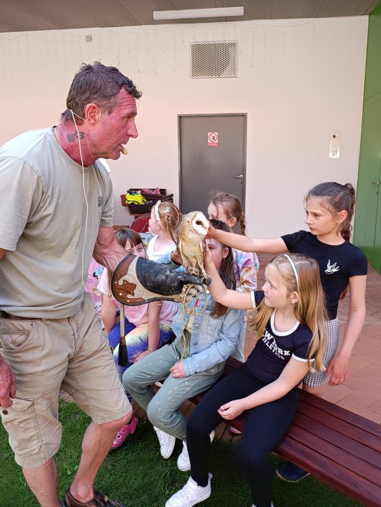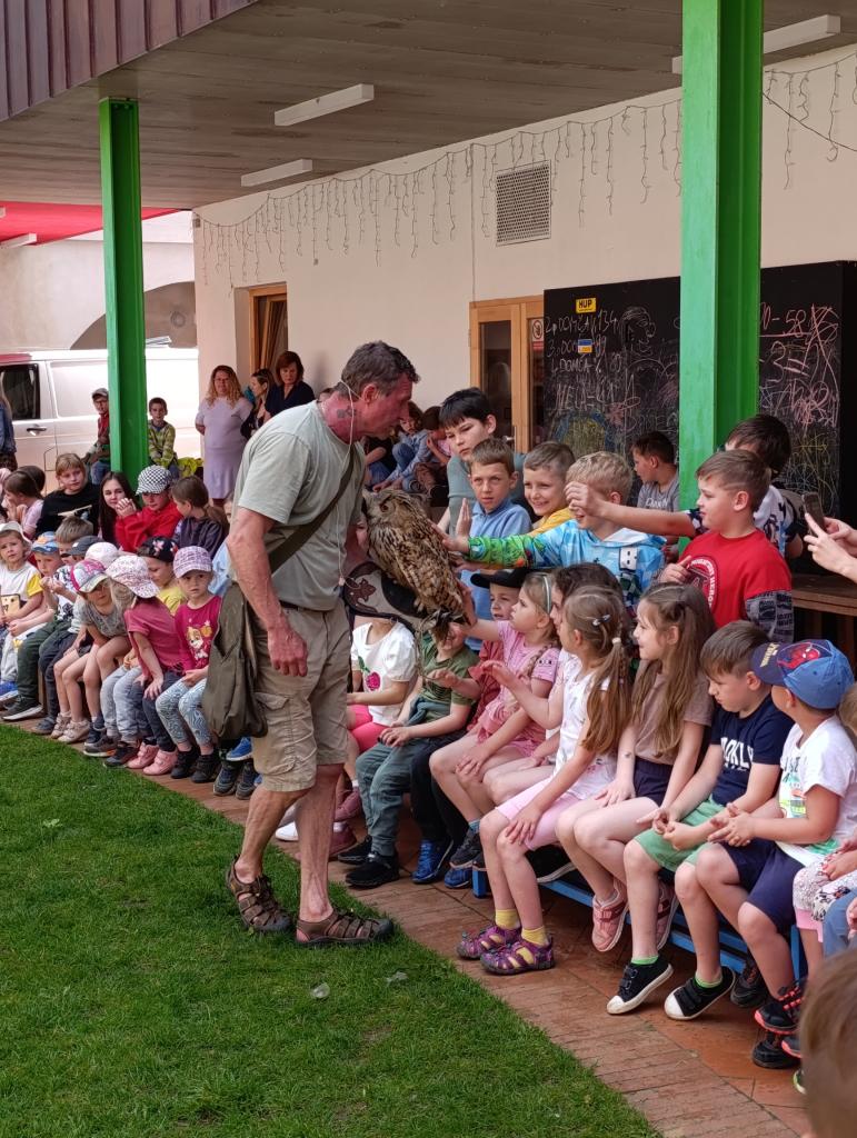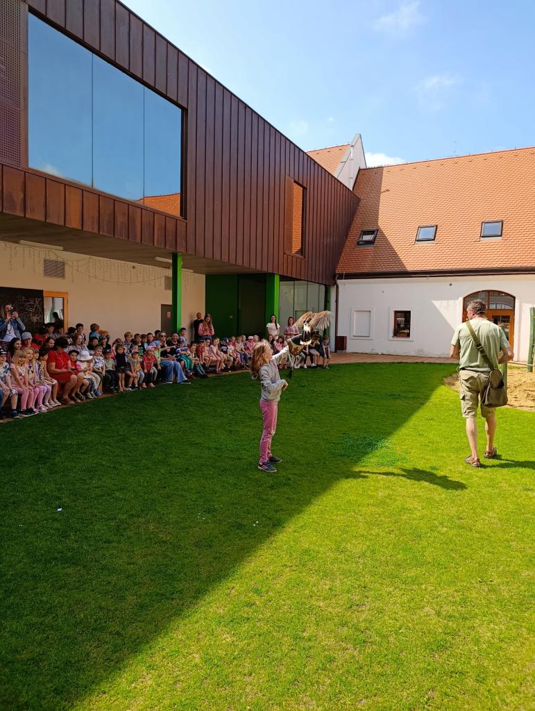 Na školním dvoře jsme tentokrát přivítali opravdu výjimečné hosty – sokolníky se svými dravci. Děti měly možnost zblízka vidět sovy, sokoly i orla, dozvěděly se spoustu zajímavostí o jejich životě, lovu i výcviku. Některé si dokonce mohly dravce podržet nebo pohladit. Byl to nevšední zážitek.